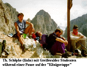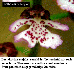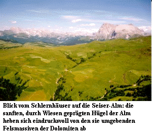 ![]() Die erstmalig 1996 durchgeführte Exkursion führt nach Südtirol in den Raum Tiers/Seiseralm. Geprägt durch die Vielfalt der kalkhaltigen Standorte und das Tourenprofil, welches von der collinen bis in die subnivale Stufe reicht, ist eine atemberaubende Artenvielzahl zu bewundern. Ein Abstecher in die westlich der Brenner-Autobahn gelegenen Sarntaler Alpen demonstriet den Unterschied der Flora zwischen Kalk- und Urgestein, nachdem zuvor jedoch bei einem Besuch Bozens Gelegenheit zur Entspannung bestand. Aus botanischer Sicht sicherlich eine einmalige Exkursion, die allerdings körperlich hohe Anforderungen an die Exkursionsteilnehmer stellt, da während der vier Tage Anstiege von insgesamt 5.000 Höhenmetern bewältigt werden müssen. Zu Beginn des ersten Tages erfolgt die Anreise von Tiers zum Nigerpaß,