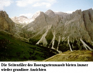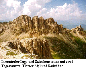 die alpine Stufe. Entlang des Weg Während die Hälfte der Tour auf einem Höhenweg bestritten wurde, der nur mit relativ moderaten Anstiegen aufwartete, entwickelt sie in der Zweiten Hälfe ihren sportlichen Charakter. Nachdem bereits zwei Sattel zu überwinden waren, sind dann am Tschager Joch die ersten 1.000 Höhenmeter vollendet. Traumhafte Fernsichten sowie Blicke in die gewaltigen Seitentäler des Rosengartenmassivs, evtl. auch der Anblick einiger Gemsen, entschädigen neben den botanischen Erlebnissen von den Anstrengungen des Tages. Auf der zweiten Tagestour wird bereits auf den Komfort der