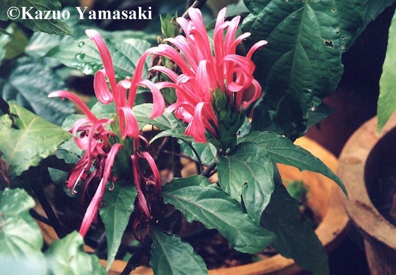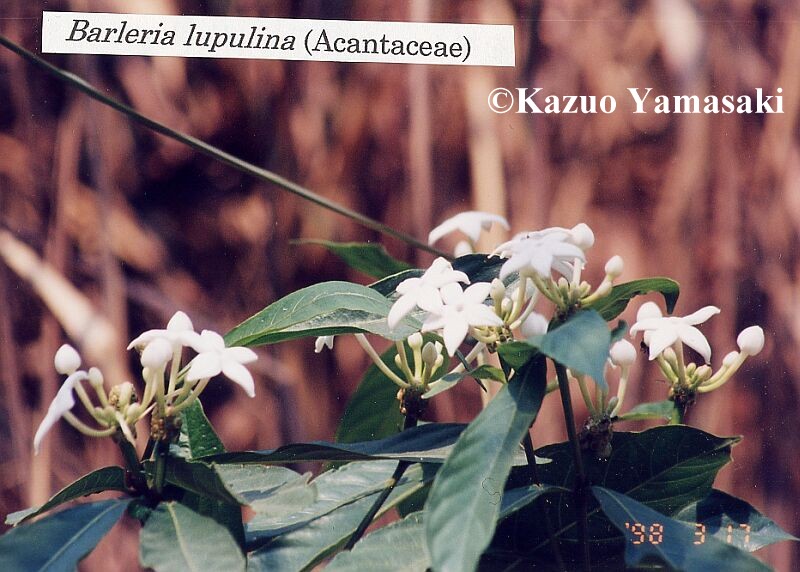 Image by Botanical Image Database (Basel) Andrographis paniculata - Image from Yamasaki Lab. Plant Photo Gallery, from Chiang Mai, Thailand (branch in flower) Andrographis paniculata - Image from Yamasaki Lab. Plant Photo Gallery, from Los Banos, Philippines (inflorescence) Barleria lupulina - Image from Yamasaki Lab. Plant Photo Gallery, from Chiang Mai, Thailand (branch in flower) Barleria prionites - Image from Yamasaki Lab. Plant Photo Gallery, from Hatyai, Thailand (branch in flower) Barleria saxatilis - Cultivated, at Kirstenbosch Botanical Garden/Cape Town (whole plants) Barleria saxatilis - Cultivated, at Kirstenbosch Botanical Garden/Cape Town (branch in flower) Barleria saxatilis - Cultivated, at Kirstenbosch Botanical Garden/Cape Town (flower) Clinacanthus nutans - Image from Yamasaki Lab. Plant Photo Gallery, from Chantaburi, Thailand (whole plants) Clinacanthus siamensis - Image from Yamasaki Lab. Plant Photo Gallery, from Kohn Kaen, Thailand (branch in flower) Dianthera candicans - Image from Yamasaki Lab. Plant Photo Gallery, from Hiroshima, Japan (branch in flower) Dianthera colorata - Image from Yamasaki Lab. Plant Photo Gallery, from Hiroshima, Japan (branch in flower) Eranthemum nervosum - Image from Yamasaki Lab. Plant Photo Gallery, from Hiroshima, Japan (flowers) Justicia carnea - Image from Yamasaki Lab. Plant Photo Gallery, from Kunming, China (inflorescence) Justicia carnea - Image from Yamasaki Lab. Plant Photo Gallery, from Hiroshima, Japan (inflorescence) Megaskepasma erythrochlamys - Cultivated (whole plant) Megaskepasma erythrochlamys - Cultivated (flower) Pachystachys lutea - Cultivated, at Greifswald Botanical Garden, Germany (whole plant) Pachystachys lutea - Cultivated, at Greifswald Botanical Garden, Germany (inflorescence) Pachystachys lutea - Cultivated, at Greifswald Botanical Garden, Germany (flower) Porphyrocoma lanceolata - Cultivated, at Greifswald Botanical Garden, Germany (whole plant) Razisea spicata - Native, from Monteverde National Park, Costa Rica (inflorescence) Rhinacanthus nasutus - Image from Yamasaki Lab. Plant Photo Gallery, from Chantaburi, Thailand (whole plant) Shaueria calycotricha - Image from Yamasaki Lab. Plant Photo Gallery, from Hiroshima, Japan (inflorescence) Thunbergia laurifolia - Cultivated (flower) Thunbergia vogeliana - Image from Yamasaki Lab. Plant Photo Gallery, from Hiroshima, Japan (branch in flower) |