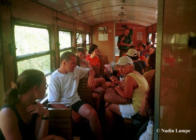 Unsere "Profs" dachten sich auch immer wieder was neues aus, um uns bei Laune zu halten, z.B. eine Fahrt mit der Schmalspurbahn, in der es zwar ziemlich eng war, wir aber trotzdem sehr viel Spaß hatten. Nur am letzten Tag konnte uns keiner mehr so richtig dazu bringen, die Gipfel zu erstürmen. Kurzerhand wurde der Freitag zum "Studentenwunschtag", was darin endete, daß wir zu einem Stausee fuhren und uns dort vergnügten. Einige schauten sich nur die Staumauer an und aßen Mittag, andere mieteten sich Boote und machten sich einen schönen Nachmittag am Strand.