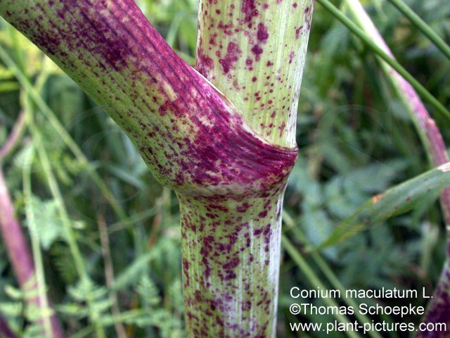 | Vergiftungssymptome treten nach peroraler Aufnahme innerhalb von 1 bis 2 Stunden auf. Zu diesen zählen: Brennen im Mund, Übelkeit, Erbrechen und Speichelfluß, Leibschmerzen, Durchfall, Muskelzittern, Krämpfe. Bei schweren Vergiftungen folgen Lähmungen der Skelettmuskulatur (aufsteigend von den unteren Extremitäten) bis hin zum Tod durch Lähmung der Atemmuskulatur.Conium maculatum L.: Die Abbildung oben zeigt die ganze Pflanze, bei der es sich um einen typischen Vertreter der Familie Apiaceae handelt. Zu den hier vorhandenen typischen Familienmerkmalen zählen die zahlreichen kleinen, weißilchen Blüten, die in Doppeldolden angeordnet sind, sowie die gefiederten Blätter (s. Abbildung in der Mitte). Die untere Abbildung zeigt das charakteristischste Merkmal der Art, den weinrot gefleckten Stengel. Die Flecken reichen bis kurz unterhalb der Infloreszenzen. | |||