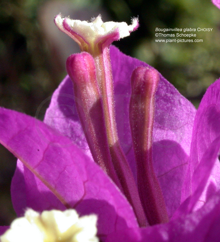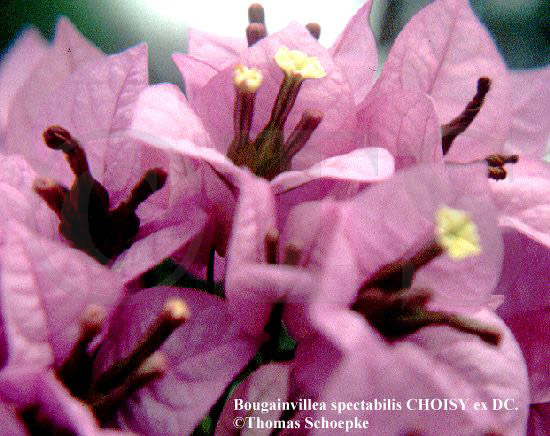 | Bougainvillea spectabilis CHOISY ex DC. (ganze Pflanze, Blütenstand mit den auffällig gefärbten Hochblättern) | (Blüte*: Kelch petaloid, kleine Hochblätter den Kelch vortäuschend) | (ganze Pflanze*, Blütenstand*, Blüte*) | ||