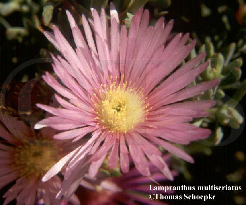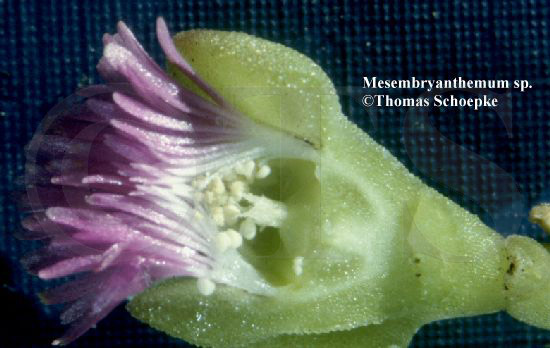 Mesembryanthemum sp.: die linke Abbildung zeigt das hier doppelte Perianth, welches sich allerdings aus dem Kalyx und zahlreichen Staminodien zusammensetzt, welche in der geschnittenen Blüte rechts neben einer Reihe von fertilen Stamina zu erkennen sind | |||