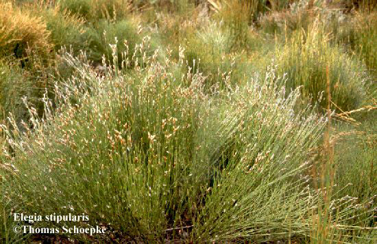 58 Gattungen mit 520 Arten; relativ große, ausdauernde, bewurzelte Kräuter mit zum Teil mit sehr ungewöhnlicher Wuchsform; Photosynthese meist im Stengel durchgeführt; Blätter stark reduziert oder wohl entwickelt, zum Teil immergrün; Xeropyhten; Pflanzen in der Regel diözisch, ansonsten zwittrig oder monözisch, anemophil; Blüten winzig oder klein, radiärsymmetrisch bis schwach zygomorph, in endständigen, ährchenähnlichen, häufig dicht gedrängten Rispen; Perianth aus 3+3 sepaloiden Tepalen bestehend oder hinfällig oder fehlend, A(1-)3, nur mit fertilen Staubblättern, weibliche Blüten zum Teil mit Staminodien, G(1-)3, in männlichen Blüten hinfällig oder fehlend, synkarp, Fruchtknoten oberständig, mit (1-)3 freien oder teilweise verwachsenen Griffeln; Kapsel- oder Nussfrüchte; warm gemäßigte Zone bis Tropen: überwiegend Südafrika und Australien, wenige Arten in Neuseeland, Madagaskar, Indochina und Chile ("Gräser" der Südhemisphäre, nehmen in Südafrika und Australien die ökologische Position der Poaceen, Juncaceen und Cyperaceen ein). Taxonomische Einordnung: Monocotyledoneae / Überordnung Commeliniflorae / Ordnung Poales, APG - Unterklasse Liliidae / Commelinoiden / Ordnung Poales. Bilder: Siehe Pflanzenbildergalerie, Familie Restionaceae. Quellen und weitere Informationen: http://delta-intkey.com*, Stevens, P.F. (2001 onwards). Angiosperm Phylogeny Website*. |