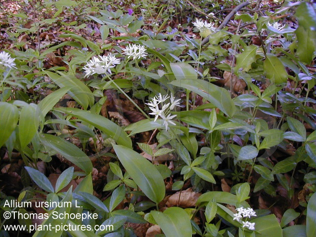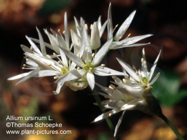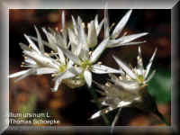 Botanische Beschreibung der Stammpflanze: Im April bis Mai blühendes, 20 bis 50 cm hohes Zwiebelgewächs mit aufrechtem Stengel und zwei Blättern. Die Zwiebel ist fast zylindrisch, 2 bis 4 cm lang und etwa 1 cm breit. An ihrer Basis entspringen einfache Wurzeln. Der Stengel ist meist zweikantig und halb zylindrisch oder dreikantig, selten auch fast stielrund. Die Laubblätter bestehen aus einem 5 bis 20 cm langen Stiel und einer 6 bis 20 cm langen, 1,5 bis 8 cm breiten Spreite. Diese ist flach, schmal-elliptisch oder elliptisch-lanzettlich bis schmal-eiförmig, zugespitzt und am abgerundeten bis fast herzförmigen Grund plötzlich in den Stiel verschmälert. Der reichblütige Blütenstand, bei dem es sich um eine lockere, 2,5 bis 6 cm breite, flache, reichblütige Trugdolde handelt, wird von 2 bis 3 eiförmig-länglichen, zugespitzten, etwa blütenstiellangen, Hüllblättern umgeben, die jedoch frühzeitig abfallen. Die 10 bis 15 mm lang gestielten, rein weißen Blüten sind 2 bis 2,5 cm breit. Sie bestehen aus 6 Perigon- und 6 Staubblättern, die jeweils in zwei Kreisen angeordnet sind, und einem aus drei Fruchtblättern gebildeten, oberständigen, tief dreifurchigen Fruchtknoten. Im Gegensatz zu vielen anderen Laucharten besitzt Bärlauch keine Brutzwiebeln. |