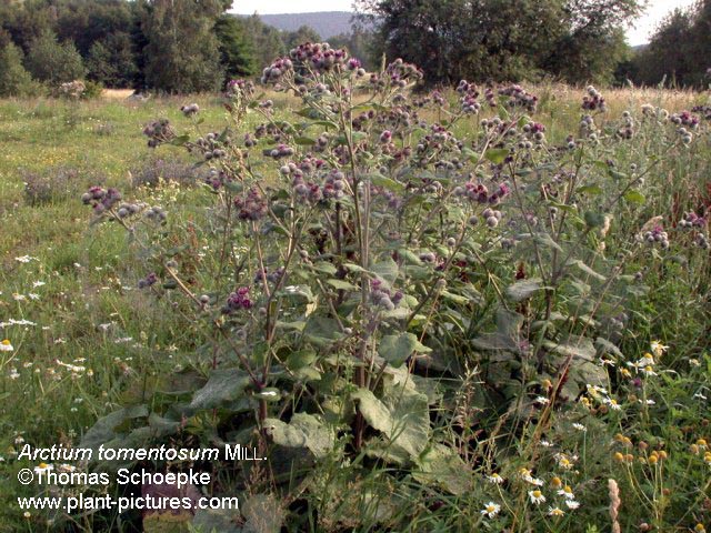 Botanische Beschreibung der Stammpflanze: Die Kletten sind hohe, zweijährige Kräuter. Sie besitzen eine dicke Pfahlwurzel. Die Stengel sind aufrecht, gefurcht und reich verzweigt, die Blätter gestielt und wechselständig. Die Blattspreite ist sehr groß, ungeteilt, breit-oval mit herzförmigem Grund und insgesamt wellig erscheinend. Die Blütenköpfe sind in Trauben oder Rispen angeordnet. Ihre Hülle ist kugelig, die Hüllblätter sind mehrreihig, lanzettlich und meist mit einer hakenförmig einwärts gebogenen Spitze versehen. Der Blütenboden ist flach. Zwischen den Blüten stehen glänzend strohfarbene, pfriemliche Spreublätter unterschiedlicher Länge. Sämtliche Blüten sind röhrenförmig und zwittrig. Die Krone ist fünfspaltig und purpurrot, die Staubfäden sind frei und kahl, die Staubbeutel geschwänzt. Die eilänglich-zusammengedrückten, gerieften, grauschwarz marmorierten Früchte besitzen einen mehrreihigen, 1 bis 3 mm langen, aus rauhen, gelblichen, leicht abbrechenden Haaren bestehenden Pappus. A. tomentosum: Blütezeit Juli bis September, Größe 60 bis 120 cm, Durchmesser der Köpfe 1,5 bis 3 cm. Die Art besitzt dicht eine spinnwebig-wollige Hülle und auf der Unterseite dicht graufilizige Blätter. Bei den innersten Hüllblätter ist die Spitze nicht gebogen sondern kurze und gerade. A. lappa und A. minus besitzen eine locker spinnwebige bis kahl Hülle und auf der Unterseite kahle oder schwach graufilzige Blätter. Sämtliche Hüllblätter weisen die klettentypische hakenförmige Spitze auf. A. lappa: Blütezeit Juli bis August, Größe 80 bis 150 cm, gelegentlich auch über 2 m, Durchmesser der Köpfe 3 bis 5 cm. Die Stiele der Grundblätter sind hohl, die Köpfe 3 bis 10 cm lang gestielt, die inneren Hüllblätter bis zur Spitze grün. A. minus: Blütezeit Juli bis September, Größe 50 bis 130 cm, Durchmesser der Köpfe 1,5 bis 3 cm. Die Stiele der Grundblätter sind markhaltig, die Köpfe sitzend oder bis 3 cm gestielt, die inneren Hüllblätter an der Spitze purpurn. |