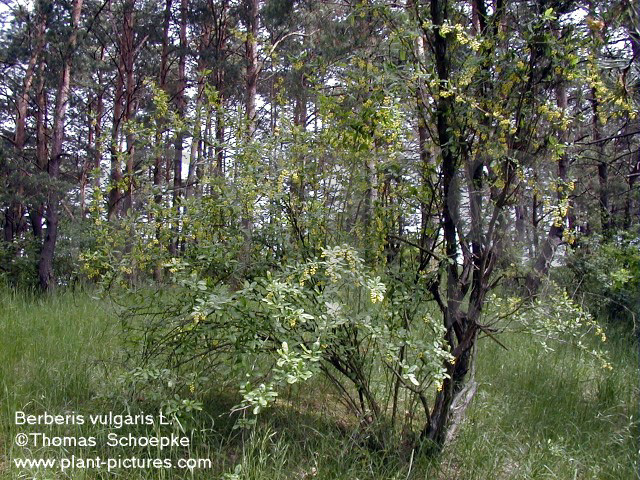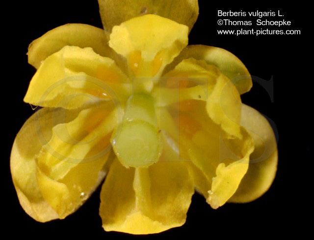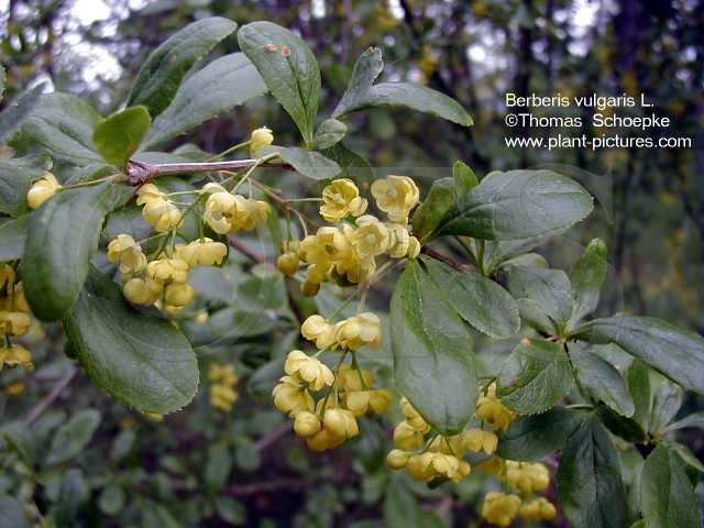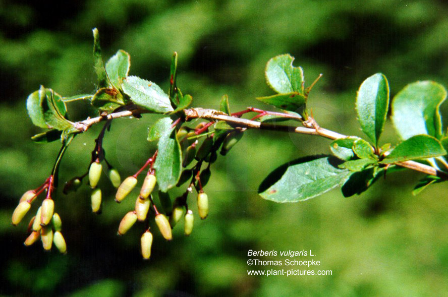 Stammpflanze: Berberis vulgaris L. / Sauerdorn, Berberitze [Fam. Berberidaceae / Berberitzengewächse]. Synonyme: Berberis jacquinii hort. ex K. KOCH, Berberis sanguinea hort. ex K. KOCH, Berberis vulgaris f. atropurpurea REGEL, Berberis vulgaris var. purpurea BERTIN ex JACQUES & Hérincq. Dt. Synonyme: Zu den zahlreichen deutschsprachigen, überwiegend regionalen und heute kaum noch benutzten Bezeichnungen zählen u. a. Baysel, Beerdorn, Bilsendorn, Dornholz, Dornstaude, Dreidorn, Dreidornenspitz, Dreifaltigkeitsdornen, Erbselbeere, Erbseldorn, Erbsele, Essigdorn, Essigzapfen, Farbholz, Geißblatt, Guggerlaub, Hasenbrot, Heilandsdorn, Judendorn, Kreuzdorn, Kronsbeer, Peiselbeere, Saurach, Schwider, Spitzbeere, Surbeere, Wehdorn, Wein-Nägelein, Weinscheidling, Weinschierling, Weinzäpfel und Zitzenbeere. Englisch: Barberry, Common barberry, European barberry, jaundice-berry, Pipperidge bush, piprage. |