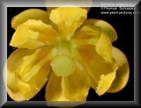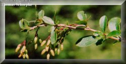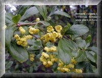 Botanische Beschreibung der Stammpflanze: Von April bis Juni blühender, bis 3 m hoher, sommergrüner, dorniger Strauch mit gezähnten Blättern. Die Langtriebe sind stark gefurcht, im ersten Jahr bräunlichgelb, später mehr weißgrau und mit großen, 1 bis 2 cm langen, meist dreiteiligen Dornen versehen, in deren Achseln Kurztriebe mit verkehrt-eiförmigen, stechend gewimperten Blättern stehen. Die gelben, dreizähligen Blüten sind in hängenden, 5 bis 7 cm langen Trauben angeordnet. Die Blütenhülle besteht aus 15 Perigonblättern, die in 5 Kreisen aus jeweils drei Blättern angeordnet sind. Die Perigonblätter besitzen am Grund zwei Nektarhöcker. Der Fruchtknoten ist oberständig, der Griffel kurz und die Narbe kopfig. Die bis 12 mm langen Beeren sind länglich und zur Reife im Oktober blutrot gefärbt. |