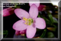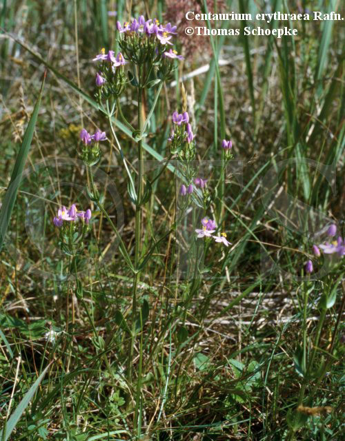 Stammpflanze: Centaurium erythraea RAFN s.l. [= einschließlich Centaurium majus (H. et L.) ZELTNER und Centaurium suffruticosum (GRISEB.) RONN.] / Echtes Tausendgüldenkraut [Fam. Gentianaceae / Enziangewächse]. Synonyme: Centaurium centaurium DRUCE, Centaurium minus MOENCH, Centaurium umbellatum GILIBERT, Erythraea centaurium (L.) PERSOON. Dt. Synonyme: Allerweltsheil, Apothekerbloom, Aurina, Bitterkraut, Blutfieberblumen, Erdgallen, Fieberkraut, Gallkraut, Gartenheyde, Geschosskraut, Goldgüldenkraut, Guldenkraut, Himmelblume, Hühnernelken, Lungenkraut, Marinken, Muttergotteskraut, Pifferkraut, Rötling, Schmeckeblümchen, Schreckkraut, Siebenundsiebzig-Spitzenkraut, Tausendguldenkraut, Unpfennigkraut, Wohlverleih. Englisch: centaury, common centaury, European centaury, pink centaury. |
