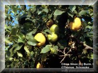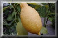 Stammpflanze: Citrus limon (L.) BURM. f. / Zitrone [Fam. Rutaceae / Rautengewächse]. Synonyme: Citrus medica L. ssp. limonum (RISSO) WIGHT. et ARN., Citrus limonum RISSO, Citrus limon BURM. Dt. Synonyme: Citronapffel, Citronenbaum, Judenäpfel, Limone. Englisch: Lemon. |