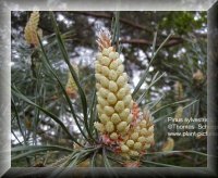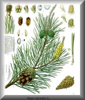 Botanische Beschreibung der Stammpflanzen: Pinus palustris ist ein 20 bis 35 m hoher Baum, dessen Stamm einen Durchmesser von 60 bis 90 cm erreichen kann und dessen Krone durch einen unregelmäßigen Umriss gekennzeichnet ist. Die gefurchte, rötlich-braune Borke löst sich in dünnen Schuppen ab. Die Knospen sind 35 bis 50 mm lang, zylindrisch und nicht harzig. Die in 3er Gruppen angeordneten, biegsamen, dünnen Nadeln stehen sehr dicht an den Trieben. An jungen Bäumen erreichen sie eine Länge bis 45 cm und bei älteren Bäumen immerhin auch noch bis 25 cm. Die fast endständig angeordneten Zapfen sind zylindrisch oder länglich-konisch, 15 bis 25 cm lang und 5 bis 7,5 cm breit mit dünnen, stark quergekielten, mattbraunen Schuppen. Die Samen sind ca.13 mm lang und stark geflügelt (Flügel etwa dreimal so lang). Pinus sylvestris kann je nach Standort 10 bis 30 m, unter Umständen auch bis 45 m hoch werden. Die Krone der Bäume ist schirmförmig. Der Umfang der entweder geraden, schlanken und zylindrischen oder knorrigen, gedrehten und recht kurzen Stämme beträgt 1,8 bis 3,6 m. Die Borke des Stammes ist im unteren Teil grauschwarz- bis dunkelbraun, nach oben fuchsrot bis rötlichgelb. Die rötlichbraunen, länglich-ovalen Knospen sind 6 bis 12 mm lang und nicht oder nur kaum harzig. Die in 2er Gruppen angeordneten, blau- bis graugrünen, unterschiedlich langen (etwa 2 bis 7 cm) Nadeln sind spitz und um ihre Längsachse gedreht. Die schon im ersten Jahr zurückgebogenen ("hängend") Zapfen stehen einzeln oder in Gruppen zu 2 bis 3. Sie sind 6 bis 12 mm lang gestielt, oval-konisch, 2,5 bis 7 cm lang und matt graubraun. Auf der sonnenzugewandten Seite sind die Schuppen meist stärker entwickelt. Die 3 bis 4 mm langen, länglichen Samen besitzen einen ca. 3mal so langen Flügel. |