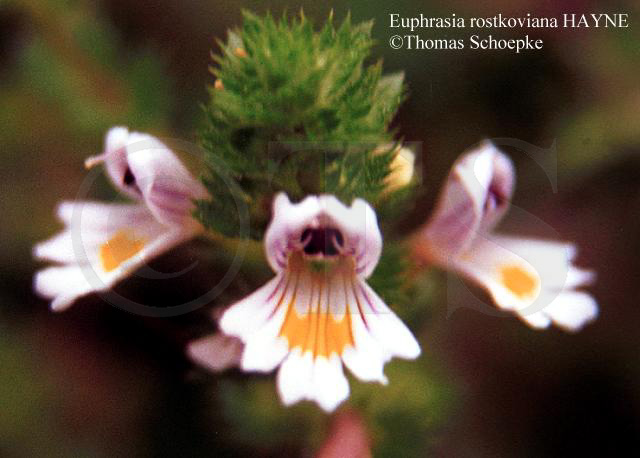 Stammpflanzen: Euphrasia rostkoviana HAYNE / Gewöhnlicher Augentrost und Euphrasia stricta D. WOLFF ex J. F. LEHM. / Steifer Augentrost sowie weitere Arten der Gattung Euphrasia. [ehemals Fam. Scrophulariaceae / Braunwurzgewächse, heute wie alle Halbschmarotzer der ursprünglichen Scrophulariaceae den Orobanchaceae / Sommerwurzgewächse zugeordnet]. Synonyme: E. rostkoviana: E. campestris JORD., E. montana JORD., E. officinalis L., E. pratensis FR.; E. stricta: E. tatarica auct. p. p.. Dt. Synonyme: Eine Unterscheidung der beiden offizinellen Augentrost-Arten ist für den Laien nur sehr schwer möglich. Demzufolge verwundert es auch nicht, dass sich praktisch sämtliche deutschsprachigen Synonyme auf den Gewöhnlichen Augentrost beziehen. Verbreitete Namen sind Gemeiner Augentrost, Wiesen-Augentrost, weitere Bezeichnungen Allerbest, Augenklar, Augenkraut, Beschreikraut, Böhmischer Klee, Christinchen, Donnerkräutchen, Gewitterblume, Karlsdistel, Magentrost, Milchdieb, Weißes Ruhrkraut, Wiesengrind, Zahnwehkraut und Zwangkraut. Englisch: eyebright. |