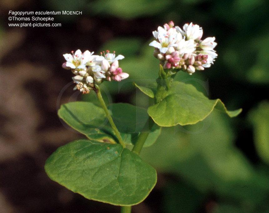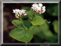 Stammpflanze: Fagopyrum esculentum MOENCH. / Echter Buchweizen, Heidenkorn [Fam. Polygonaceae / Knöterichgewächse]. Synonyme: Fagopyrum sagittatum GILIB., Fagopyrum vulgare HILL., Polygonum fagopyrum L. sowie Fagopyrum cereale (SALISB.) RAFIN., Fagopyrum sarracenicum DUMORT., Fagopyrum vulgare HILL., Phegopyrum esculentum (MOENCH) PETERM., Polygonum cereale SALISB. Dt. Synonyme: Zu den regionalen, heute kaum noch gebrauchten Namen zählen Blenden, Brandkorn, Dreikantiger Weizen, Dreikorn, Franzweizen, Gricken, Haden, Haritsch, Heidefench, Heidekasch, Heidenbrein, Moorweite, Srasn, Tatelkorn, Tater, Türchskorn und Welschkorn. Englisch: buckwheat, Japanese buckwheat, silverhull buckwheat. |