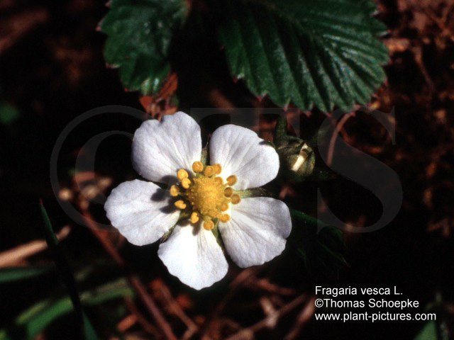 Botanische Beschreibung der Stammpflanze: Alle Arten der Gattung sind ausdauernde, krautige, im Mai und Juni blühende Pflanzen, die eine einfache oder verzweigte Grundachse und häufig lange oberirdische Ausläufer besitzen. Die Stengel sind schaftartig, aufrecht und meist blattlos, die Laubblätter dreizählig gefingert und lang gestielt. Die Teilblätter weisen in der Regel einen kräftigen Mittelnerv auf, von dem ausgehend die Seitennerven fischgrätenartig in den grob gesägten Blattrand verlaufen. Blüten in meist armblütigen Trugdolden, mit fünf Kelchblättern, ebenso vielen weißen Kronblättern sowie zahlreichen Staubblättern und Fruchtknoten. Aus dem Blütenboden entwickeln sich rot gefärbte Scheinfrüchte, auf denen die kleinen Nussfrüchte aufsitzen. F. x ananassa besitzt große Blüten (Durchmesser 2,5 bis 3,7 cm) und lederartige Blätter, deren Oberseite fast kahl ist. Die drei anderen offizinellen Arten besitzen kleinere Blüten (Durchmesser maximal 2,8 cm) und niemals lederartige Blätter, deren Oberseite zudem stets deutlich behaart ist. Bei F. moschata ist die gesamte Blattunterseite abstehend behaart und der Stengel überragt die Blüten, bei F. vesca und F. viridis ist die Blattunterseite anliegend behaart (falls doch abstehend dann nur am Grund des Blattes). Bestes Unterscheidungsmerkmal von F. vesca und F. viridis ist der Blütenboden, der bei F. vesca nur am Grund einen Haarkranz besitzt und ansonsten kahl ist, wogegen der von F. viridis fein langhaarig ist. |