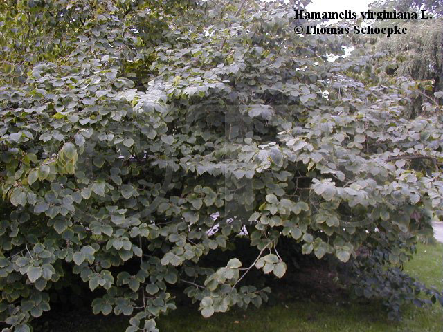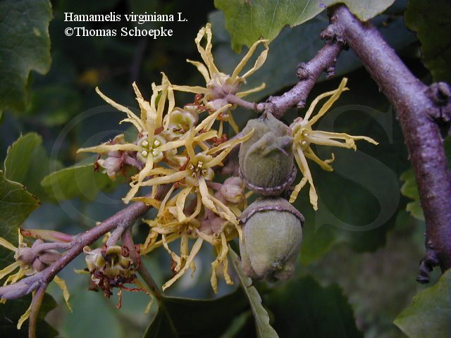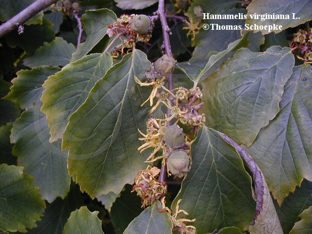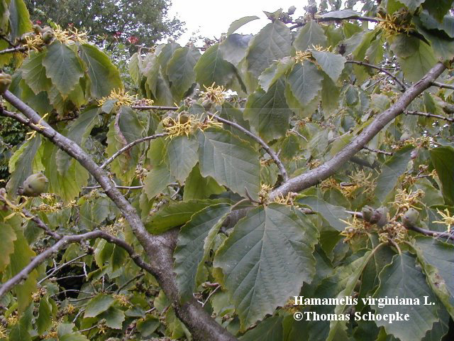 Verbreitung: Laubwälder der atlantischen Staaten der USA, vom südlichen Kanada bis Texas und Nordflorida, westlich bis Wisconsin, Nebraska und Missouri. Bereits im Jahr 1736 wurde Hamamelis nach Englang eingeführt und wird seitdem dort sowie später auch in anderen europäischen Ländern als Garten- und Parkpflanze gepflanzt. |