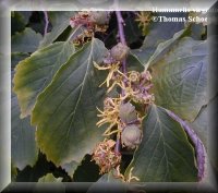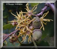 Stammpflanze: Hamamelis virginiana L. / Hamamelis [Fam. Hamamelidaceae / Hamamelisgewächse]. Synonyme: Alternative Bezeichnungen sind heute sowohl in der wissenschaftlichen als auch der Laienliteratur nicht mehr anzutreffen. Daher findet man Namen wie z. B. Hamamelis caroliniana WALT., Hamamelis dentata MOENCH, Hamamelis macrophylla PURSH, Hamamelis nigra RAF., Hamamelis virginica L. und Trilopus dentata RAF. nur in älteren, fast ausschließlich aus der Zeit vor 1900 stammenden Schriften. Dt. Synonyme: Hexenhasel, Virginische Zaubernuss, Virginischer Zauberstrauch, Zauberhasel, Zaubernuss, Zauberstrauch. Englisch: Magicians rod, pistachio nut, snapping hazelnut, spotted alderstriped alder, winter bloom, witch hazel, witch-hazel. |