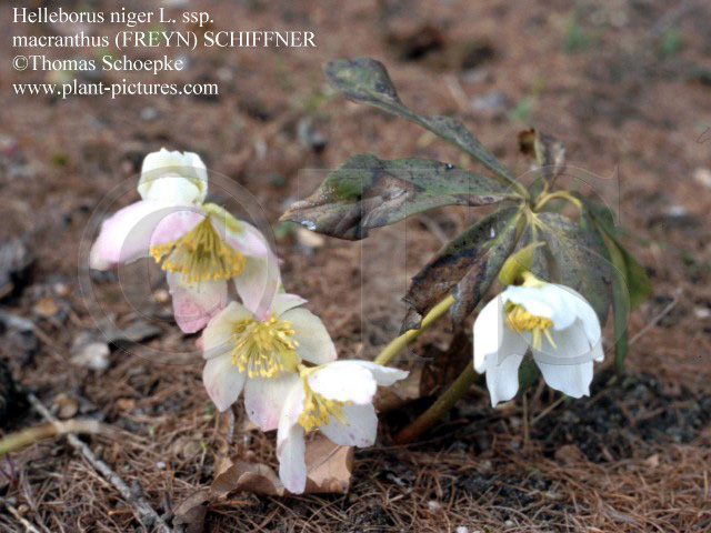 Botanische Beschreibung der Stammpflanze: H. niger: 15-30 cm hohes, von Dezember bis April blühendes, ausdauerndes Kraut mit kräftigem, bis 10 cm langem Wurzelstock, dem zahlreiche fleischige Wurzeln entspringen. Blätter winterhart, grundständige lang gestielt, ledrig, dunkelgrün, fußförmig 7-9teilig, die des Blütenstengels ungeteilt. H. viridis: Ähnlich der zuvor beschriebenen Art, jedoch bis 40 cm hoch und im Frühjahr (März bis Mai) blühend. Blätter nicht winterhart. Zwei grundständige, 7-13fach fußförmig geteilte Blätter und ebenfalls geteilte Stengelblätter. |