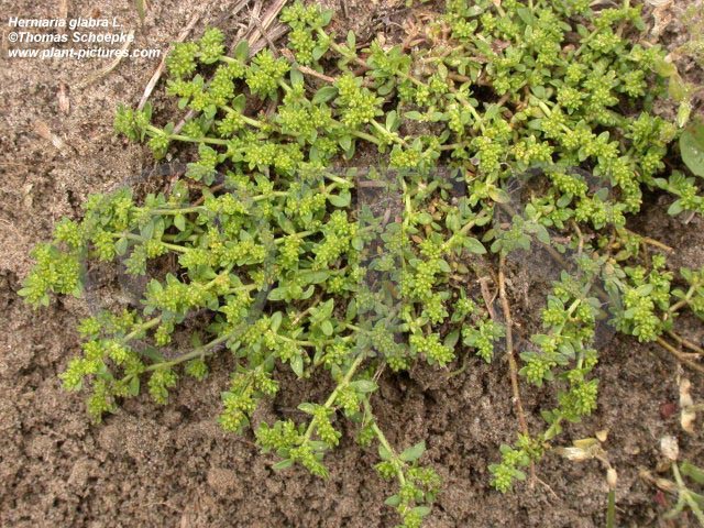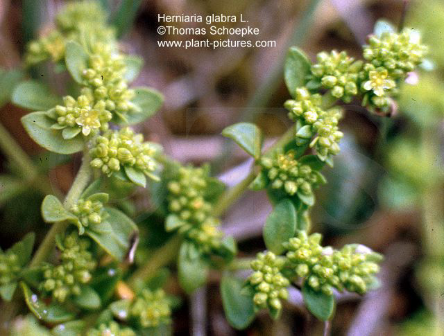 Botanische Beschreibung der Stammpflanze: Kleine, dem Boden anliegende, einjährige bis wenige Jahre alt werdende Kräuter mit reich verzweigtem Stengel und kleinen, unscheinbaren, gelbgrünen Blüten mit einfacher Blütenhülle. Die von Juni bis Oktober blühende H. glabra besitzt eine frischgrüne bis gelbgrüne Farbe. Der 5 bis 30 cm lange Stengel ist kahl oder sehr kurz kraushaarig. Die bis 10 mm langen, ungestielten, undeutlich einnervigen Blätter sind gegenständig angeordnet, durch Verkümmern des einen Blattes oben scheinbar wechselständig. Die Blattspreite ist eiförmig-lanzettlich oder elliptisch, vorne zugespitzt und gegen den Grund verschmälert. Die Nebenblätter sind klein, eiförmig, weißhäutig, verwachsen und am Rande gefranst. Die sehr kleinen, mit dem Achsenbecher kaum mehr als 0,6 mm langen Blüten sind in bis zehnblütigen, blattachsel- oder scheinbar blattgegenständigen, fast ungestielten Knäueln angeordnet. Die Blütenhülle besteht aus 5 eiförmigen, stumpfen, gelbgrünen, schmal hautrandigen, kahlen bis kurz gewimperten oder auf dem Rücken mit wenigen, sehr kurzen Haaren besetzten Perigonblättern. Staubblätter 5, Fruchtknoten in den Achsenbecher fast eingesenkt, mit 2 fast sitzenden Narben. Die Kapselfrucht ist eiförmig, auf dem Scheitel spitzwarzig, etwa 0,6 mm lang und damit genauso lang oder etwas länger als die Blütenhülle. Die zahlreichen Samen sind schwarz, glänzend und linsenförmig. Die von Juli bis September blühende H. hirsuta ist infolge ihrer dichten, kurzen, steifen, abstehenden Behaarung graugrün gefärbt. Der Stengel ist nur 5 bis 20 cm lang, die Blütenhüllblätter besitzen vorne eine oder mehrere, bis 1 mm lange Stachelborsten und umhüllen die Reife Kapsel vollständig. |