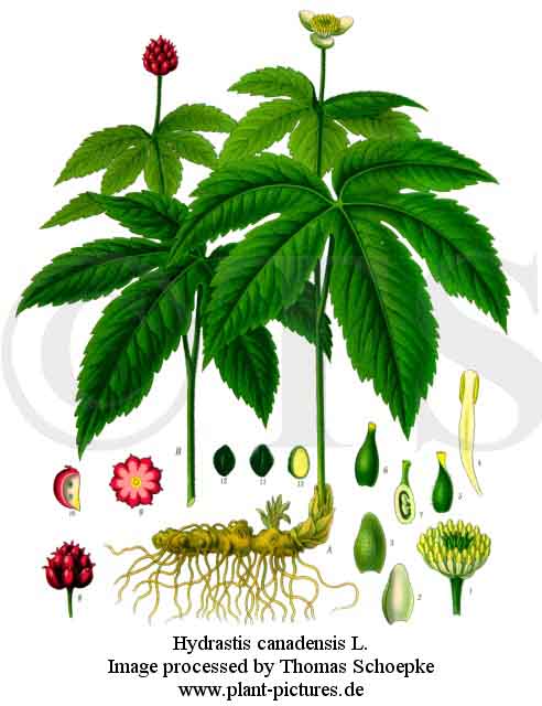 Stammpflanze: Hydrastis canadensis L. / Kanadische Gelbwurzel [Fam. Ranunculaceae / Hahnenfußgewächse]. Synonyme: Warneria canadensis LILL., Warneria diphylla RAF., Warneria tinctoria RAF. Dt. Synonyme: Blutkrautwurzel, Blutwurz, Gelbes Blutkraut, Gelbsuchtwurzel, Goldsiegel, Kanadische Orangewurz, Wasserblatt, Wasserkraut. Englisch: goldenseal. Weitere, weniger gebräuchliche Bezeichnungen sind Eye balm, Ground rasberry, Indian dey, Indian paint, Indian turmeric, Ohio curcuma, orangeroot, Turmeris root, Yellow eye root, Yellow paint, yellow-puccoon, Yellow root und Yellow seal. |