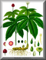 Botanische Beschreibung der Stammpflanze: Mehrjährige, etwa 30 cm hohe Pflanze mit kriechendem, unterirdischem Rhizom und wenigen oberirdischen Trieben. Das Rhizom ist unregelmäßig geformt, knotig, hellgelb, etwa 5 cm lang und 1 cm dick und mit deutlichen Stengelnarben versehen. In frischem Zustand enthält es einen gelben Saft. Die dem Rhizom entspringenden, leicht abbrechenden Wurzeln sind bis zu 30 cm lang. Der aufrechte, zylindrische, behaarte, nur zwei Blätter tragende Stengel wird am Grunde von kleinen, braunen Schuppen umschlossen. Die dunkelgrünen, behaarten, im Umriss runden, 5- bis 7fach fingerförmig gelappten Blätter besitzen einen doppelt gezähnten Rand. Das lang gestielte Grundblatt besitzt einen Durchmesser von 10 bis 20 cm, die Stengelblätter sind kleiner. Das obere Stengelblatt ist nur noch sehr kurz gestielt. In seiner Achsel entspringt der ca. 2 cm lange Blütenschaft, der eine einzelne Blüte trägt. Die Blütenhülle besteht lediglich aus drei grünlichweißen Kelchblättern, die kurz nach dem Aufblühen abfallen. Staubblätter und freie Fruchtknoten sind in großer Zahl vorhanden. Aus den Fruchtknoten entwickelt sich eine Sammelfrucht. Diese besteht aus etwa 12 kleinen, zur Reife hochroten Teilfrüchten, die breit-eiförmige, mit einem linealischen Nabel versehene, harte, schwarze, glänzende Samen enthalten. |