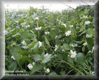 Stammpflanzen: Lamium album L. / Weiße Taubnessel [Fam. Lamiaceae / Lippenblütengewächse]. Synonyme: Lamium capitatum SM., Lamium vulgatum var. album BENTH. Dt. Synonyme: Für die Arten der Gattung Namen existieren zahlreiche deutschsprachige Synonyme. Zu diesen zählen besonders Bezeichnungen, die sich auf die brennnesselartigen Blätter beziehen wie Blinde Brennnessel, Doofnettel, Hühnernessel, Hundsnessel, Sengnessel, Staubbrennnessel, Taube Nessel, Wilde Brennnessel und Zahme Brennnessel. Auf das Vorhandensein von Nektar, welches von Kindern aus den Blüten gesaugt wurde, beziehen sich Namen wie Sauger, Honigsauger, Lutschblom, Suggelblume, Zuckersauger und Zuckerschnuller. Weitere Namen sind Bienesaug, Erzengel, Heilig Fleisch, Honigblume, Hummel, Immenblume, Löffelblume, Milchblume, Windisch und Wurmnessel. Synonyme für Weiße Taubnessel sind u. a. Gewitterblume, Weiße Goldessel, Weiße Brennnessel, Weisse Hummel, Weißer Kuckuck und Weißes Taubenkröpfchen. Englisch: white dead-nettle, white nettle. |