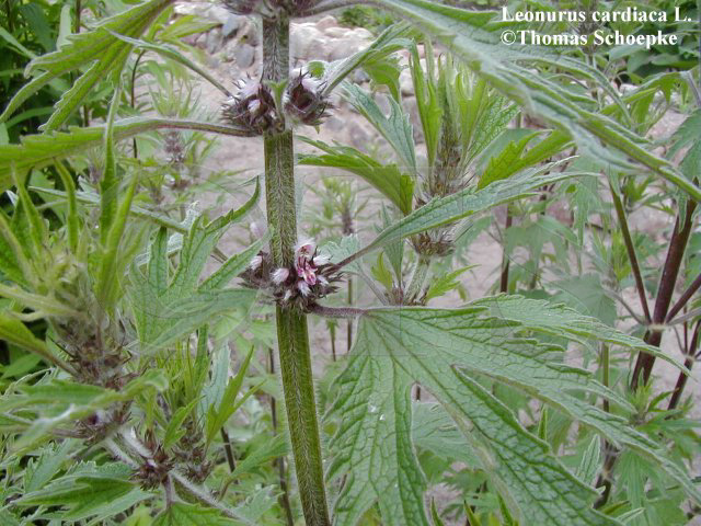 Stammpflanzen: Leonurus cardiaca L. / Herzgespann [Fam. Lamiaceae / Lippenblütengewächse]. Synonyme: Cardiaca trilobata LAM., Cardiaca vulgaris MOENCH, Leonurus campestris ANDRZ., Leonurus canescens DUMORT, Leonurus trilobatus (LAM.) DULAC. Dt. Synonyme: Beschreikraut, Hertzkraut, Herzgesperr, Herzspan, Löwenschwanz, Sibirischer Löwenschwanz, Wild Mutterkraut, Wolfsfuß, Wolfsschwanz, Wolfstapp, Wundkraut. Englisch: Motherwort. |