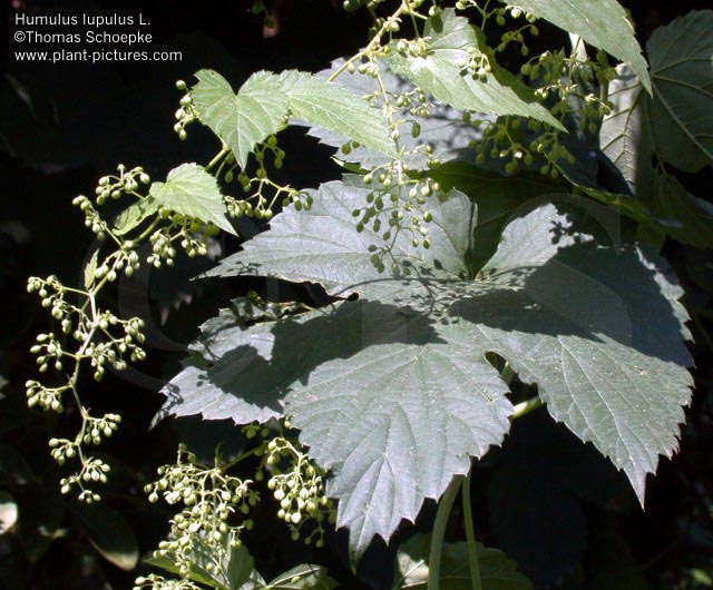 Botanische Beschreibung der Stammpflanze: Diözische, ausdauernde, windende Pflanze mit gegenständigen Blättern. Einjährige Triebe bis 6 m lang, in Kultur bis 12 m. Stengel nicht verholzend, mit kleinen, zweispitzigen, steifen Haaren besetzt. Blätter drei- bis fünflappig, mit rauen Borsten versehen. Männliche Blüten grünlich, ca. 5 mm im Durchmesser, in herabhängenden Rispen angeordnet, weibliche Blüten ebenfalls klein, jedoch in dichtblütigen, stark verzweigten Infloreszenzen, aus denen sich unter Beteiligung der Hochblätter die 2-5 cm langen und 1-2 cm breiten Fruchtstände = Hopfenzapfen bilden. |