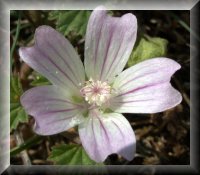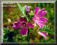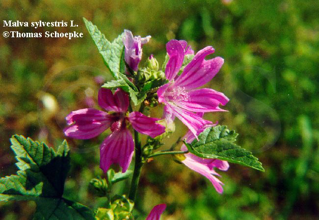 Botanische Beschreibung der Stammpflanzen: Malva sylvestris: Vom Juni bis Oktober blühendes zweijähriges oder ausdauerndes, 0,3 bis 1,2 m hohes Kraut. Der nieder liegende bis bogig aufsteigende, gelegentlich auch aufrechte Stengel ist ästig verzweigt und am Grund leicht verholzt. Die Blätter sind 3- bis 7-teilig gelappt, bis 12 cm lang und bis 15 cm breit, am Grunde eingebuchtet, auf der Oberseite schwach und auf der Unterseite stärker behaart. Etwa 2 bis 6 Blüten stehen auf 1 bis 2,5 cm langen Blütenstielen, die den Blattachseln entspringen. Die einzelnen Blüten werden von einem dreiblättrigen Außenkelch umgeben. Die Außenkelchblätter sind länglich-eiförmig, 4 bis 8 mm lang und 3- bis 6mal so lang wie breit. Kelchblätter fünf, bis 6 mm lang, bis etwa zur Mitte miteinander verwachsen. Kronblätter fünf, 15 bis 30 mm lang, 3- bis 4mal so lang wie der Kelch, tief ausgerandet, rosaviolett, purpurn bis weiß gefärbt, mit jeweils 3 kräftigen, dunklen Längsstreifen. Staubblätter zahlreich, Staubfäden zu einer 10 bis 12 mm langen Röhre verwachsen. Fruchtknoten oberständig, aus 9 bis 11 Fruchtblättern gebildet. Fruchtstiele aufrecht oder abstehend, Früchte nahezu scheibenförmig (an einen Schweizer Käse erinnernd; -> s. deutsche Synonyme), 7 bis 9 mm breit und etwa 2 mm dick, recht schnell in die kahlen oder auf dem Rücken behaarten Teilfrüchte zerfallend. Malva neglecta: Von Juni bis Oktober blühende, meist niederliegende bis aufsteigende, selten auch aufrechte, einjährige bis ausdauernde Pflanze. Stengel 10 bis 50 cm lang, ästig verzweigt. Blätter rundlich oder nierenförmig, am Grunde herzförmig; wellig 5- bis 7teilig gelappt, jedoch höchstens bis zu 1/5 der Spreitenlänge geteilt. Blattstiel etwa dreimal so lang wie die Blattspreite. Oberseite der Spreite spärlich behaart bis fast kahl, Unterseite mehr oder weniger behaart mit einzelnen oder in Büscheln stehenden Haaren. Blüten paarig oder zu mehreren, selten auch einzeln den Blattachseln entspringend. Blütenstiel mehrere cm lang. Außenkelch bestehend aus drei schmal-lanzettlichen, 4 bis 5 mm langen, beidseitig behaarten, am Rand bewimperten Blättern. Kelchblätter fünf, außen behaart, bis zur Hälfte verwachsen, Kelchzipfel ganzrandig oder undeutlich gezähnelt. Kronblätter fünf, 5 bis 15 mm lang, etwa doppelt so lang wie der Kelch, tief ausgerandet, hellrosa bis weiß, mit etwas dunklerer Nervatur. Staubblätter zahlreich, Staubfäden zu einer ca. 6 mm langen Röhre verwachsen. Fruchtstiele abwärts gebogen, Früchte scheibenförmig, 6 bis 7 mm breit und bis 2 mm dick, alsbald in an den Kanten abgerundete, glatte Teilfrüchte zerfallend. |