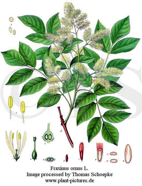 Stammpflanzen: Fraxinus ornus L. s. l. / Manna-Esche [Fam. Oleaceae / Ölbaumgewächse]. Synonyme: Fraxinus mannifera STEUD., Fraxinus rotundifolia MILL., Ornus europaea PERS. Dt. Synonyme: Blühende Esche, Blumenesche, Staneschen, Weiß-Esche, Zwergesche. Englisch: European flowering ash, flowering ash, manna, manna ash. |