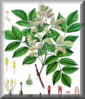 Botanische Beschreibung der Stammpflanze: Bis 10 m hoher, zwischen April und Juni blühender Baum mit grauer, warzigkrustiger Rinde. Von anderen (einheimischen) Eschen durch die doppelte Blütenhülle und die (silbrig- bis bräunlich)grauen Knospen zu unterscheiden. Junge Zweige olivgrün oder bräunlichgrün, etwas glänzend, mit zahlreichen, hellgrünlichen Lentizellen. Blätter gegenständig angeordnet, 4 bis 8 cm lang gestielt und unpaarig gefiedert. Die 7 bis 9 Fiederblättchen sind im Umriss elliptisch bis eilanzettlich oder eiförmig. Ihr Rand ist kerbig gesägt, die Oberseite sattgrün, die Unterseite heller grün. Die vierzähligen Blüten stehen in reichblütigen, aufrechten, später überhängenden Rispen. Die Kelchblätter sind nur etwa 1 mm lang. Die weißen, am Grunde paarweise miteinander verbundenen Kronblätter besitzen eine Länge von 7 bis 15 mm. Staubblätter 2, fast so lang wie die Kronblätter und damit den Fruchtknoten weit überragend, mit gelben Staubbeuteln. Fruchtknoten oberständig, Griffel etwas zusammengedrückt, Narbe dick, zweilappig, Nussfrüchte hängend, zungenförmig, 3 bis 4 mm lang und 7 bis 10 mm breit und geflügelt. Samen eiförmig und flach, braun, 15 bis 20 mm lang und 4 bis 5 mm breit. |