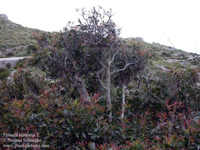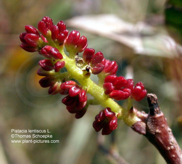 Stammpflanze: Pistacia lentiscus L. / Mastixstrauch [Fam. Anacardiaceae / Sumachgewächse]. Synonyme: Pistacia chia DESF., Pistacia mutica RAUL et BOISS., Pistacia terebinthus var. angustifolia LEE et LAM., Pistacia terebinthus ssp. vulgaris ENGL., Terebinthus vulgaris CUP. Dt. Synonyme: Ewiges Holz, Lentiske, Mastixbaum, Mastix-Pistazie, Pistakistrauch, Restringe, Zahnstöcherbaum. Englisch: Chios mastictree, mastic, lentisk, mastic tree, mastictree. |