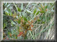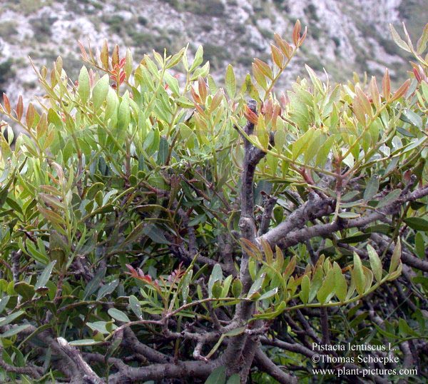 Botanische Beschreibung der Stammpflanze: Der Mastixstrauch ist ein 1 bis 3 m hoher, kräftig bewurzelter, dichtästiger, immergrüner Strauch oder Baum. Die Rinde ist braun und schuppig, die einjährigen Zweige kahl und rotbraun. Die 2- bis 5-fach gefiederten Laubblätter besitzen eine breit geflügelte Spindel. Die 1,5 bis 3 cm breiten, ganzrandigen, völlig unbehaarten, steif ledrigen Fiederblättchen sind lanzettlich, stumpf, auf der Oberseite glänzend hellgrün und auf der Unterseite matt bleichgrün. Die Blüten sind sehr klein und unscheinbar. Die Blütenhülle von männlichen und weiblichen Blüten ist auf den unscheinbaren, ca. 1,5 mm langen Kelch reduziert. Die Blüten sind in kompakten, 1 bis 3 cm langen Trauben angeordnet. Die männlichen Blüten enthalten 4 bis 5 Staubblätter mit großen, dunkelrot gefärbten Staubbeuteln. Die weiblichen Blüten besitzen einen oberständige Fruchtknoten und eine dreilappige Narbe. Aus ihnen entwickelt sich eine kugelige, bespitzte, anfangs rote, später schwarze Frucht mit einem Durchmesser von 3 bis 4 mm. |