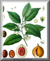 Gewinnung der Droge: Geerntet wird überwiegend in den Monaten Juni bis Oktober. Die Ernte durch Pflücken oder Auflesen muss exakt einen Tag nach dem Aufplatzen der Fruchtwand erfolgen, da bei unreifen Früchten die Samen verschrumpeln und bei länger am Boden liegenden Früchten ein Befall durch Würmer erfolgt ("verwurmte Qualität"). Fruchtwand und Samenmantel werden unmittelbar nach der Ernte entfernt. Das Trocknen erfolgt bei Temperaturen von maximal 45 °C, wobei der Trocknungsprozess etwa 4 bis 8 Wochen andauert. Nach Entfernung der Samenschale werden die Samenkerne zum Schutz vor Insektenfraß in einen frischen Brei aus Seewasser und gebranntem Kalk getaucht. |