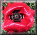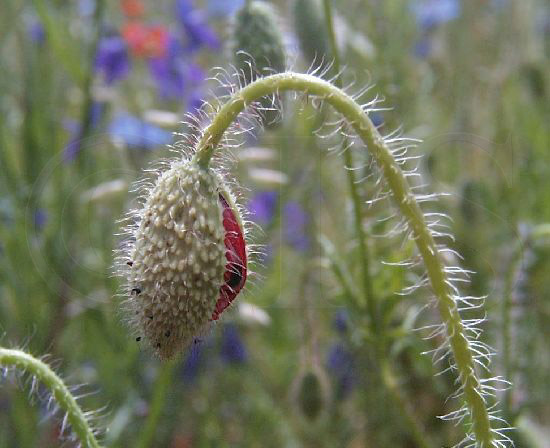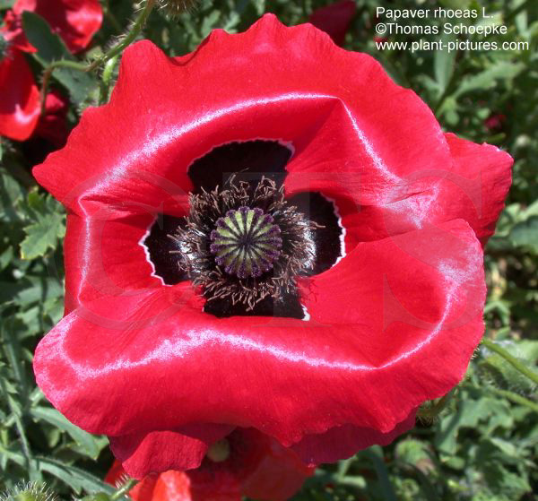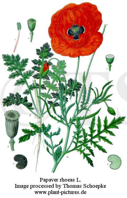 Botanische Beschreibung der Stammpflanze: Im Zeitraum von Mai bis Juli blühende, 25 bis 90 cm hohe einjährige oder einjährig überwinternde Pflanze. Stengel aufrecht bis aufsteigend, verzweigt und stets beblättert, abstehend-steifhaarig. Laubblätter im Umriss länglich-lanzettlich, einfach bis doppelt fiederschnittig bis fiederspaltig, die oberen oft dreiteilig. Untere Blätter in den Stiel verschmälert und stark borstig behaart, obere Blätter sitzend. Blattrand grob eingeschnittenen bis scharf gesägt. Blüten meist nickend auf langen Stielen, die in den Achseln von Laubblättern entspringen und ebenfalls meist abstehend borstig behaart sind. Blütendurchmesser etwa 10 cm. Kelchblätter 2, grün, dicht abstehend borstig behaart, sofort nach dem Aufblühen der Blütenknospe abfallend. Kronblätter 4, rundlich und ganzrandig, selten auch gekerbt oder an der Spitze eingeschnitten, Durchmesser 2 bis 4 cm, Farbe leuchtend scharlachrot oder stark purpurrot, selten auch weiß oder violett, am Grund mit einem glänzenden, normalerweise weiß berandeten, tiefschwarz Fleck. Staubblätter zahlreich, mit dunklen, unverdickten, linealischen Staubfäden und blaugrünen, kurzen Staubbeuteln. Fruchtknoten verkehrt-eiförmig mit abgerundetem Grund. Kapselfrucht breit eiförmig, mit abgerundetem Grund, 1 bis 2 cm lang und 0,5 bis 1 cm breit. Narbenscheibe kurz, kegelförmig, mit 8 bis 12 Narbenstrahlen. Samen nierenförmig, dunkelbraun, netzig-grubig. |