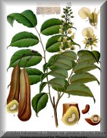 Botanische Beschreibung der Stammpflanze: Bis etwa 16 m hoher Baum, dessen ausgebreitete und aufsteigende Beastung bereits in einer Stammhöhe von 2 bis 3 Metern beginn. Die bei den jungen Zweigen glatte, graue bzw. ins Purpur fallende Rinde ist mit zahlreichen weißen oder gelblichen Lentizellen bedeckt. Die kurz gestielten, unpaarig gefiederten Blätter sind etwa 15 bis 20 cm lang und bestehen aus 7 bis 11 nicht gegenständigen Blättchen. Die Blattspindel und der etwas verdickte Stiel ist mit einem dichten Filz sehr kurzer, rötlich-gelber Haare bedeckt, die ledrigen, am Rande gefalteten Fiederblättchen sind ungefähr 6 cm lang und 3 cm breit, länglich-eiförmig, eilanzettlich oder manchmal etwas verkehrt eiförmig, an der Basis gerundet und vorne zugespitzt. Auf der Unterseite tritt die Mittelrippe stark hervor und beim Betrachten gegen das Licht sind durchscheinende Ölbehälter erkennbar. In den Blattachseln entspringen schlanke, lang gestielte, 15 bis 17 cm lange, lockere Trauben, die zahlreiche Blüten enthalten. Blütenspindel, die sehr kleinen Tragblätter der Blüten und die Blütenstiele sind mit einem sehr kurzem, gelblich-roten Filz bedeckt. Der außen ebenfalls rötlich-gelb behaarte Kelch ist weitbecherförmig mit 5 sehr seichten, stumpfen Zähnen. Die Kronblätter sind weiß mit 4 linealisch-lanzettlichen Kronblättern und einer fächerförmig ausgebreiteten, fast kreisrunden, etwas zurück gebogenen und vorne ausgerandeten Fahne. Die 10 freien, in gleicher Höhe mit den Kronblättern dem Kelch eingefügten Staubblätter bestehen aus pfriemlichen, weißen, glatten, an der Basis etwas verbreiteten Staubfäden und länglichen Staubbeuteln, die nur wenig kürzer als die Staubfäden sind. Der dem Grunde des Kelches entspringende, lang gestielte Fruchtknoten ist etwas zusammengedrückt und glatt mit kurzem, etwas gekrümmtem, spitzem Griffel und kleiner, punktförmiger Narbe. Die scheinbar doppelt gestielte, gelbliche oder blass orangebraune Hülse ist 7 bis 18 cm lang und 3 bis 4 cm breit, stark zusammengedrückt, am Grunde verschmälert, nach dem anderen Ende, welches den einzigen, nierenförmigen Samen enthält, allmählich verdickt, seitlich durch den Griffel gespitzt und nicht aufspringend. |