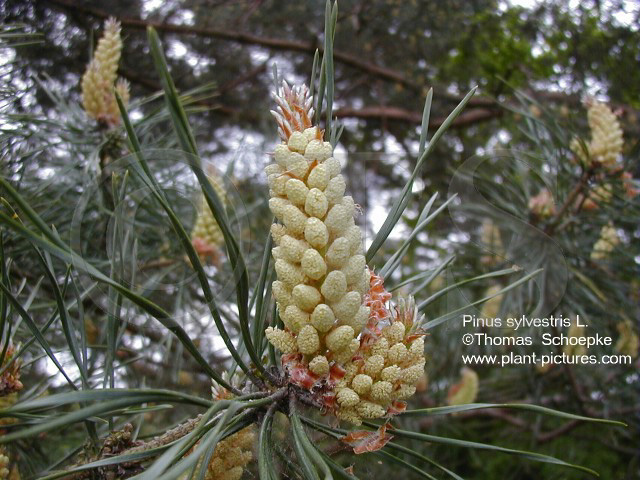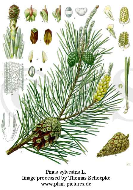 Stammpflanzen: Pinus sylvestris L. / Gemeine Kiefer oder andere, nicht näher bezeichnete Arten der Gattung Pinus [Fam. Pinaceae / Kieferngewächse]. Bei letzteren handelt es insbesondere um Pinus nigra J. F. ARNOLD / Schwarzkiefer oder Pinus pinaster SOLAND. / Strandkiefer Synonyme: Pinus sylvestris: Pinus nigra MILL., Pinus nigra f. pygmaea (Carrière) Rehder, Pinus sylvestris f. nana (Carrière) LILA. Pinus nigra: Pinus austriaca HOESS, Pinus laricio POIR., Pinus nigricans HOST in SAUT. Pinus pinaster: Pinus maritima LAM. (nom. illeg.). Dt. Synonyme: Pinus sylvestris: Gebräuchlich und weithin bekannt ist die Bezeichnung Föhre. Zu den zahlreichen meist nur regional und heute nur noch selten gebrauchten Namen zählen Deichelholz, Doose, Dosenbaum, Fackel, Ferge, Fohre, Fohren, Föhrenbaum, Füre, Hartzbaum, Kienbaum, Kiene, Kiffe, Küfferbaum, Kühne, Mandel, Mantel, Pechbaum, Pinbaum, Preußenholz, Schleißbaum, Schleißholz, Schleißkiefer, Schmierbaum, Spanbaum, Tällenbaum, Ziege und Ziegenholz. Weiterhin finden sich auch die im Normalfall für die Gattung Picea A. DIETR. (Fichte) und Abies MILL. (Tanne) benutzen Namen wie Deutsche Fichte, Fichtenbaum, Kienfichte, Krätzfichte, Kuhficht, Wilde Fichte bzw. Gemeine Tanne, Odenwälder Tanne, Rauhtanne, Tanne und Zederdann. Pinus nigra: Lärchenkiefer, Schwarzföhre. Pinus pinaster: Igelkiefer, Meerfichte, Meerfuhre, Meerkiefer, Sternkiefer, Seekiefer, Seestrandkiefer. Englisch: Pinus sylvestris: pin sylvestre, Scotch pine, Scots pine. Pinus nigra: black pine. Pinus pinaster: Bournemouth Pine, cluster pine, maritime pine, pinaster, seaside Pine, tree of gold. |
