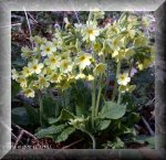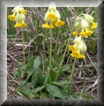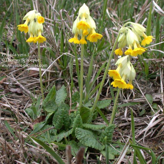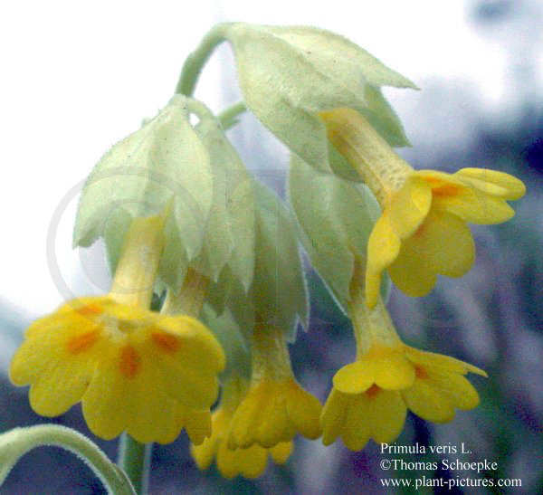 Stammpflanzen: Primula veris L. / Wiesen-Schlüsselblume und Primula elatior (L.) HILL. / Hohe Schlüsselblume [Fam. Primulaceae / Primelgewächse]. Synonyme: Primula elatior - Keine gebräuchlich; Primula veris - Primula officinalis (L.) HILL., seltener auch Primula coronaria SALISB., Primula montana REUT. und Primula odorata GILIB. Dt. Synonyme: Größtenteils in deutschen volkstümlichen Benennungen keine Unterscheidung der beiden offizinellen Primula-Arten. Zu den zahlreichen älteren, häufig regionalen Bezeichnungen zählen Weiße Schlüsselblume (nur für P. elatior), Arznei-Primel, Batenke, Eierblume, Frühlings-Schlüsselblume, Fünfwundenblume, Handschuhblumen, Hängeli, Heiratsschlüssel, Himmelsblume, Himmelsschlüssel, Hühnerblind, Kirchenschlüssel, Märzblom, Maiblümel, Osterblume, Peters Schlüssel, Pluderhose, Primel, Primelrose, Schlagkraut und Schlüsselrose. Englisch: Primula elatior - oxlip, true cowslip; Primula veris - cowslip. |