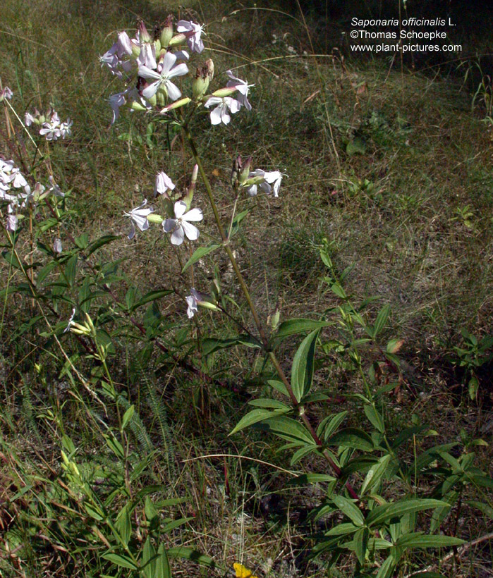 Stammpflanze: Saponaria officinalis L. / Echtes Seifenkraut [Fam. Caryophyllaceae / Nelkengewächse]. Synonyme: Bootia nervosa GILIB., Bootia saponaria NECK., Bootia vulgaris NECK., Lychnis officinalis (L.) SCOP., Lychnis saponaria JESS., Saponaria hybrida MILL., Saponaria nervosa GILIB., Saponaria vulgaris PALL, Silene officinarum RUPR., Silene saponaria FRIES. Dt. Synonyme: Gemeines Seifenkraut, Seifenkraut, Seifenwurz, Waschkraut. Englisch: Bouncing bet, bruise wort, fuller's herb, hedge pink, soapwort. |
