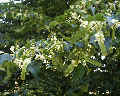 Beschreibung der Droge: Die Droge besteht aus dem gesamten Blütenstand, dem neben den Blüten und ihren Stielen auch die der Verbreitung dienenden Hochblätter angehören. Diese sind gelbgrün gefärbt, zungenförmig, häutig (sehr brüchig und fast durchscheinend) und fast kahl. Das zentrale Gefäß des Hochblattes ist etwa bis zur Hälfte mit dem Blütenstand verwachsen. Die Anzahl der Einzelblüten schwankt, je nach verwendeter Art, zwischen 2 und 16. Die Blüten bestehen aus etwa 6 mm langen, leicht abfallenden Kelchblättern, die außen kahl und an der Innenseite sowie den Rändern dicht behaart sind, 5 spatelförmigen, bis 8 mm langen, dünnen, gelblichweißen Kronblättern sowie zahlreichen freien Staubgefäßen, die meist in fünf Gruppen angeordnet sind. Der Fruchtknoten ist oberständig und trägt einen Griffel, der in einer wenig ausgeprägten Narbe mündet. |